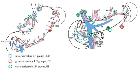 Extra-perigastric lymph node groups (EP), lesser curvature lymph node groups (LC), and greater curvature lymph node groups (GC) around the stomach. Figure source: Japanese Gastric Cancer Association (JGCA) [].