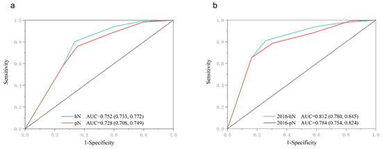 Comparison of AUC of hN and pN under N stage for training cohort and validation cohort, respectively. (a) AUC of training cohort, hN AUC = 0.752 (0.733, 0.772), pN AUC = 0.728 (0.708, 0.749). (b) AUC of validation cohort, 2016-hN AUC = 0.812 (0.780, 0.845), 2016-pN AUC = 0.784 (0.754, 0.824).