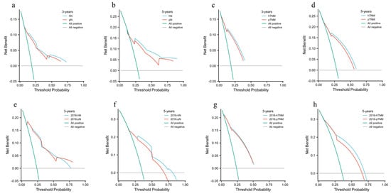 DCA results showed that in the validation cohort, hN staging and hTNM staging were better than pN and pTNM in the 3rd and 5th years (Figure 3a–d), with a higher area under the curve. In addition, the results of the training cohort were well verified in the validation cohort (Figure 3e–h).