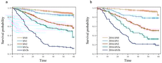 The Kaplan–Meier curves of the 5-year overall survival (OS) rate of each subgroup under the condition of hN in the training cohort and the validation cohort are shown in Figure 4a,b, with p < 0.01 among each stratum. The hN stage had significant statistical differences under each N stratum, indicating that the hN stage had a good stratification (Figure 4)