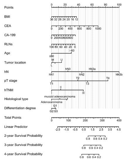 In order to determine the independent risk factors affecting the prognosis of patients under the hN stage, Cox risk regression model analysis was performed. Univariate analysis showed that BMI, CEA, CA-199, MLNs, RLNs, LNRs, age, tumor location, hN stage, pT stage, hTNM stage, pathological tumor type, degree of differentiation, and tumor size were statistically significant. Multivariate analysis showed that BMI, CEA, CA-199, RLNs, age, tumor location, hN stage, pT stage, hTNM stage, and pathological type were independent risk factors related to the prognosis of patients (Table 5). Based on multivariate regression analysis, a prognostic Nomogram was established according to independent prognostic factors (Figure 5) to show the relationship between each predictor variable in the prediction model.