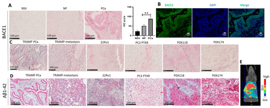 As mentioned above, BACE1 is a principal protease required to produce Aβ from the amyloid precursor protein. Therefore, immunostaining of Aβ1-42 deposits was performed to confirm the functional activity of BACE1 in prostate tumors. Immunostaining of the samples confirmed the Aβ1-42 deposition in TRAMP primary tumors, TRAMP abdominal metastasis, 22Rv1 xenografts, PC3-paclitaxel-resistant (PTXR) xenografts, and patient-derived xenografts (Figure 1D). The PET tracer [11C]PiB specifically binds to fibrillar amyloid-beta plaques. Therefore, Aβ1-42 deposition was confirmed by the [11C]PiIB PET imaging (SUV = g/mL) of TRAMP tumors (Figure 1E).