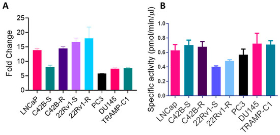 Human non-malignant immortalized prostate epithelial cell line PWR-1E as well as human PCa cell lines LNCaP, PC3, DU145, and mouse TRAMP-C1 cancer cells were purchased from American Type Culture Collection (Manassas, VA, USA). PWR-1E cells were cultured in keratinocyte serum-free media with human recombinant epidermal growth factor and bovine pituitary extract (cat# 10724-011, Gibco, Thermo Fisher Scientific, Waltham, MA, USA). LNCaP cells were grown in RPMI 1640 medium (cat# 11875119, Gibco, Thermo Fisher Scientific, Waltham, MA, USA) with 10% fetal bovine serum (FBS) (cat# 16000044, Gibco, Thermo Fisher Scientific, Waltham, MA, USA). PC3 and DU145 cells were grown in RPMI 1640 media (cat# 11875119, Gibco, Thermo Fisher Scientific, Waltham, MA, USA) with 10% heat-inactivated FBS (cat# 10082147, Gibco, Thermo Fisher Scientific, Waltham, MA, USA). TRAMP-C1 cells were maintained in DMEM media supplemented with 5% FBS, 5% Nu-Serum (cat# CB55004, Fisher Scientific), 10 nM dehydroisoandrosterone (cat# 853-23-6, Millipore Sigma, Burlington, MA, USA), 0.005 mg/mL bovine insulin (cat# I6634, Millipore Sigma, Burlington, MA, USA), 1× GlutaMAX (cat# 35050061, Gibco, Thermo Fisher Scientific, Waltham, MA, USA) and 1× sodium pyruvate (cat# 11360070, Gibco, Thermo Fisher Scientific, Waltham, MA, USA). Enzalutamide-sensitive (S) and -resistant cells (C4-2B-S, C4-2B-R, 22Rv1-S, 22Rv1-R) were cultured in RPMI 1640 media with 10% FBS, and only resistant cells were cultured in 20 µM enzalutamide (cat# S1250, Selleckchem, Houston, TX, USA), as reported by us earlier [21]. A total of 100 U/mL penicillin G and 100 µg/mL streptomycin sulfate (cat# 15070063, Gibco, Thermo Fisher Scientific, Waltham, MA, USA) were added to each media. The cells were maintained in a humidified incubator with 5% CO2 at 37 °C.
