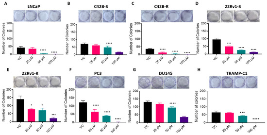 To investigate the role of BACE1 in the viability of PCa cells, cells were treated with a potent and selective pharmacological inhibitor of BACE1 (MK-8931) [26], and an MTT assay was performed. The results demonstrated that the MK-8931 treatment (25–200 µM) significantly decreased the viability of all the PCa cell lines tested after 24 h, 48 h, and 72 h of treatment (Figure 3). Next, we assessed the long-term effect of BACE1 inhibition on the growth of PCa cells in a colony formation assay. As shown in Figure 4, MK-8931 treatment (25–100 µM) strongly reduced the clonogenicity of PCa cells in a dose-dependent manner (Figure 4).