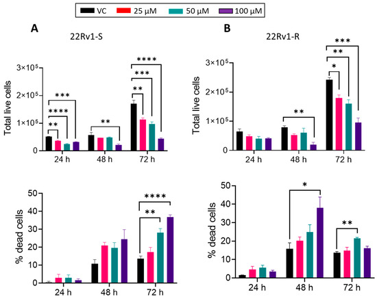 The effect of BACE1 inhibition on cell proliferation and death in enzalutamide-sensitive and -resistant 22Rv1 PCa cells. (A) 22Rv1-S and (B) 22Rv1-R cells were treated with vehicle control (DMSO) or MK-8931 (25–100 μM) for 24–72 h. At the end of each time point, total live cells and % dead cells were counted (n = 3/group). Analysis was performed using one-way ANOVA and results are plotted as mean ± SEM. * p < 0.05, ** p < 0.01, *** p < 0.001, and **** p < 0.0001.