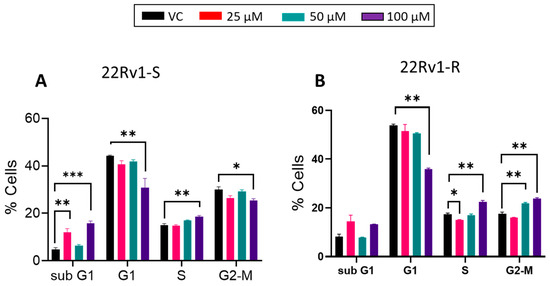 Next, we characterized the cell cycle distribution in these cells following MK-8931 treatment. As shown in Figure 6, MK-8931 treatment increases the sub-G1 population in both 22Rv1-S and 22Rv1-R cells, though this increase was not dose-dependent. Furthermore, in 22Rv1-S, a significant decrease in the G1-phase cell population was observed at the 100 µM dose of MK-8931. In 22Rv1-R cells, MK-8931 treatment resulted in a decreased percentage of cells in the G1-phase, while a slight increase in S-phase and G2-M-phase cells was observed at the higher doses (50 and/or 100 µM).