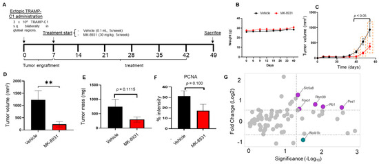 BACE1 inhibitor treatment reduces the in vivo growth of TRAMP-C1 allografts in syngeneic murine model. (A) Schematic representation of the experimental design. TRAMP-C1 cells were engrafted bilaterally into the flanks of wild-type C57BL6 mice. After one week of engraftment, mice were treated with either vehicle control or MK-8931 (30 mg/kg, IP) for 5 weeks. (B,C) Animal body weight and tumor volume was measured over the course of the study. Data are presented as mean ± SEM. Analysis was performed using multiple t-test analysis. Significant comparisons are outlined in dashed boxes for control versus MK-8931, p < 0.05. (D,E) Allografts were excised; volume (mm3) and weight (mg) were measured ex vivo. Data are presented as mean ± SEM. Analysis was performed using Student’s t-test. ** p = 0.019. (F) IHC analysis for PCNA expression in the tumor tissue of vehicle- and MK-8931 treated mice. Data are presented as mean ± SEM. Analysis was performed using Student’s t-test. (G) Pathway analysis of genes related to mouse prostate cancer pathway. Data are presented as volcano plot; significantly altered genes are highlighted as purple solid circles.