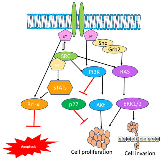A number of preclinical studies also reported a substantial proapoptotic effect with Bcl-XL antisense RNA and with a combination of EGFR-targeted tyrosine kinase inhibitors (TKIs), which might prove the efficiency of EGFR therapy. The study carried out by Bonavia and coworkers reported the expression of EGFRvIII and its impact on IL-6 [66,67]. The high expression of EGFRvIII influenced by IL-6 promoted the proliferation of tumor cells in vitro, and IL-6 significantly influenced the expression of Bcl-XL and STAT3 in another tumor. Several cellular subtypes are involved in GBM; among them, EGFR plays an important role with other receptors. Different receptor tyrosine kinases are also altered in GBM, leading to downstream activation of some other proteins that are activated by EGFR and that are highly influenced by survival regardless of EGFR inhibitors [68]. Another protein, PTEN, plays a key role in the EGFR inhibitor pathway because it has been shown to contribute to resistance in EGFR-targeted therapies. In PTEN-deficient cell lines, EGFR is activated by downstream signaling permanently and manipulates the autophagic pathway by preventing TKI-induced caspase activation via accumulation of heat-shock protein αB-crystallin. The proapoptotic effects also remarkably increased after treatment with erlotinip and mTOR inhibitors, inhibiting the autophagy-specific events [69]. The EGFR family complex system is also engaged in growth factor cellular signaling; phosphorylation of EGFR at the plasma membrane leads to the recruitment of several proteins via the binding of Src homology 2 (SH2) and phosphotyrosine-binding (PTB) domains to the receptor’s phosphotyrosine motifs [70]. The EGFR signaling complex initiates a number of signaling cascades that are crucial in tumor proliferation, motility, differentiation, and survival (Figure 1). Surprisingly, comparable substrates are activated with varying degrees of strength downstream of EGFR and EGFRvIII. The phosphoinositide 3-kinase (PI3K), signal transducer and activator of transcription number, Src family kinases, and mitogen-activated protein kinase (MAPK) pathways also play a crucial role in the EGFR downstream mechanism [71]. The heterodimer form of PI3Ks significantly triggers the adaptor proteins and RTKs via regulatory subunits such as p50a, p55a, and p85a or PIK3R1. The interaction of p85a with EGFR via ErB3 heterodimerization or phosphorylation of EGFR by c-Src results in conformational changes in p85a and the release of inhibition of PI3K catalytic subunit p110. As a result, it is found in the plasma membrane, where it catalyzes the synthesis of phosphatidylinositol 3,4,5-triphosphate (PIP3) by phosphorylation of PIP2 [72].