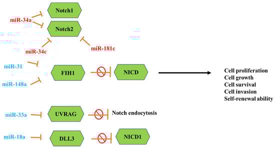 Representation of the important miRNAs that effectively regulate the Notch signaling pathway in glioblastoma. Red miRNAs are downregulated, and cyan ones are upregulated.