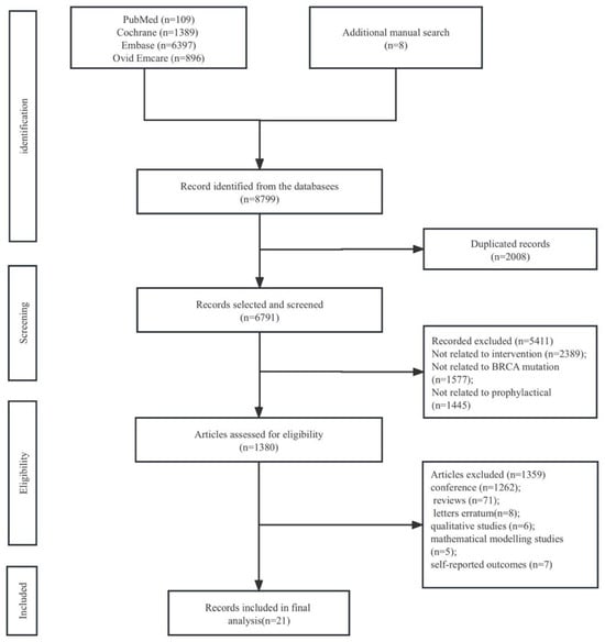 Our search identified 8799 studies: 109 from PubMed, 1389 from Cochrane, 6397 from Embase, and 896 from Ovid Emcare, and there were eight records identified from a manual search of Google Scholar, other review articles, and reference lists of searched records. After excluding 2008 duplicate records, a total of 6791 records were included in the screening process. A total of 5411 records that are not related to intervention, BRCA mutation, or prophylactic interventions for BRCA carriers were excluded, leading to 1380 studies for further eligibility screening. Study types were further limited to only include epidemiologic studies, RCT, case–control studies, cohort studies, etc., and 1359 studies were excluded. A total of 21 articles were included in the data synthesis analysis (Figure 1). The characteristics of the included articles are summarized in Table 1.