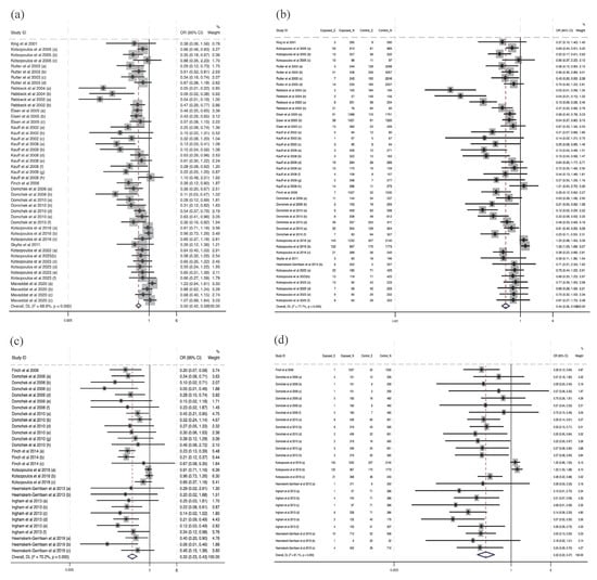 All the studies have been included in the meta-analysis. The clarification of sub-studies in Figures are mentioned in Tables S1 and S2. In the overall comparisons, the effectiveness of interventions mentioned in the studies indicated a significant reduction in cancer risk at post-intervention compared with the control conditions using data directly extracted from the studies (OR = 0.48, 95% CI (0.41, 0.56), = 68.0%, p < 0.001), and self-calculated data (OR = 0.44, 95% CI (0.36, 0.54), = 77.2%, p < 0.001). Also, compared with the effectiveness for cancer risk reduction, there was a larger protective effect on the mortality of interventions, both in the data directly extracted from studies (OR = 0.32, 95% CI (0.24, 0.44), = 70.2%, p < 0.001) and in the self-calculated data (OR = 0.32, 95% CI (0.22, 0.48), = 80.1%, p < 0.001). Substudies from studies conducted by Rebbeck et al., 2004 [32], Kauff et al., 2008 [25], Domchek et al., 2010 [10], Heemskerk-Gerritsen, 2013 and 2019 [20,21], Kaas et al., 2010 [23], and Meijers-Heijboer et al., 2001 [30], as well as Finch et al., 2014 [19], were excluded from Figure 2b–d, and substudies by Mavaddat et al., 2020 [29] were omitted from Figure 2a since there were no cancer cases or deaths in the intervention group, so the estimated ORs were zero and thus the 95% CI cannot be estimated. The analysis identified several outliers in the substudies. Specifically, Kauff et al., 2008 [25] (OR = 1.10, 95% CI (0.48, 2.51)) and Mavaddat et al., 2020 [29] (OR = 1.23, 95% CI (0.94, 1.61)), as shown in Figure 2a, and Kauff et al., 2008 [25] (OR = 1.21, 95% CI (0.54, 2.72)) and Kotsopoulos et al., 2017 [28] in Figure 2b–d, reported findings where the intervention condition was associated with an increased cancer risk or mortality risk.