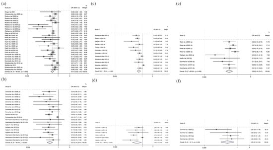 Forest plots of subgroup analysis for intervention for BRCA1/2, BRCA1, and BRCA2 mutation carriers [10,12,16,17,18,19,20,21,22,24,25,26,27,28,29,31,32,33,34]. Notes: panel (a) provides a synthesis of odds ratios for cancer risk reduction in all BRCA mutations. Panel (b) displays odds ratios for disease risk associated with BRCA1 mutations. Panel (c) presents odds ratios for disease risk linked to BRCA2 mutations. Panels (d–f) illustrate the synthesis of ORs for mortality risk reduction corresponding to all BRCA mutations, BRCA1 mutations, and BRCA2 mutations, respectively.
