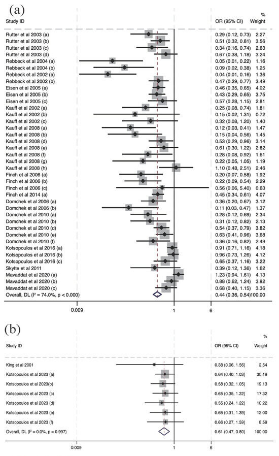 Forest plots of the effectiveness of interventions in OC risk and mortality risk reduction [10,16,24,31,33]. Notes: panel (a) indicates the effectiveness of oophorectomy in OC risk reduction and panel (b) indicates the effectiveness of oophorectomy in OC-specific mortality risk reduction.