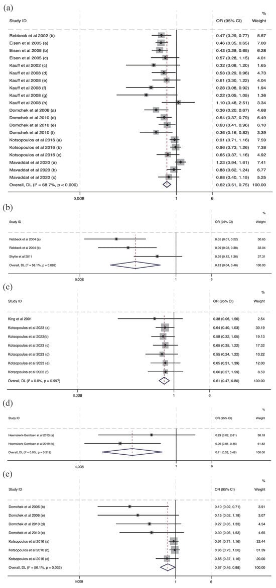 Forest plots of different interventions’ effectiveness in BC risk and mortality [10,12,16,17,20,21,24,25,26,28,29,32,34]. Notes: panel (a) indicates the effectiveness of oophorectomy in BC risk reduction. Panel (b) indicates the effectiveness of mastectomy in BC risk reduction. Panel (c) indicates the effectiveness of chemoprevention in BC risk reduction. Panel (d) indicates the effectiveness of mastectomy in BC-specific mortality risk reduction. Panel (e) indicates the effectiveness of oophorectomy in BC-specific mortality risk reduction.