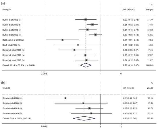 Prophylactic oophorectomy reached a statistically significant level and was found to have a protective effect on OC risk (OR = 0.29, 95% CI (0.18, 0.47), p < 0.01, Figure 6a), and there was no statistically significant effect on OC-specific mortality (Figure 6b) (OR = 0.62, 95% CI (0.51, 0.75)).