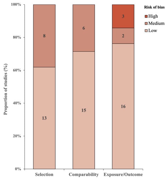 Figure 7 illustrates the risk of bias across three categories: Selection, Comparability, and Exposure/Outcome. For each category, the studies are divided into three levels of bias: high, medium, and low. In the Selection category, eight studies exhibited a high risk of bias, while thirteen displayed a low risk. Comparability had six studies with a high risk of bias and fifteen with a low risk of bias. Lastly, in the Exposure/Outcome category, three studies had a high risk of bias, two had a medium risk of bias, and sixteen had a low risk of bias.