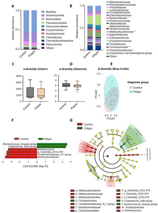 Figure 1 presents the main fecal microbiota profiles of the two groups: the control and polyps. The relative abundance of phyla in the control and polyps groups followed the order Bacillota (former Firmicutes) > Actinomycetota > Bacteroidota > Pseudomonadota (formerly Proteobacteria) > Verrucomicrobiota (Figure 1A). The family Methanobacteriaceae was significantly less abundant in the polyps group than in the control group (1.37% vs. 2.11%, respectively), and the same was observed for Oscillospiraceae and Christensenellaceae, which were more abundant in the control group than in the polyps group (Figure 1B) (3.08% vs. 2.18% and 1.89% vs. 1.26%, respectively). Alpha diversity, represented by Chao1 and Shannon indices (Figure 1C,D), did not differ significantly between the groups. Regarding beta diversity, principal coordinate analysis (PCoA) based on the Bray–Curtis dissimilarity index using all OTU normalized relative abundances did not clearly separate the groups (Figure 1E). Linear discriminant analysis effect size (LEfSe) testing was conducted to identify the genera contributing the most to differentiating the control and polyps group. Differentially increased abundances of the Ruminococcus_torques group (family: Lachnospiraceae; order: Lachnospirales) and Eubacterium_hallii (family: Lachnospiraceae; order: Lachnospirales) in contrast to decreased abundances of Ruminococcus (family: Ruminococcaceae; order: Oscillospirales), g_Clostridia_UCG-014, the Christensenellaceae R-7 group (family: Christensenellaceae; order: Chistensenellales), and Methanobrevibacter (family: Methanobacteriaceae; order: Methanobacteriales) were the most relevant differences found between the feces samples from individuals diagnosed with polyps with respect to the controls (Figure 1F). The cladogram generated from the LEfSe results (Figure 1 G) highlights the enrichment of the order Coriobacteriales and members from the family Lachnospiraceae, as well as the depletion of the families Christensenellaceae, Oscillospiraceae, f_Clostridia_UCG-014, and Methanobacteriaceae in the polyps group.