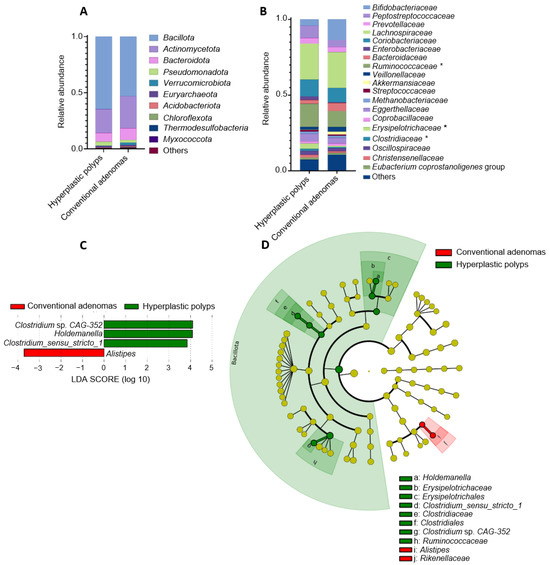 Differences in fecal microbiota compositions from individuals diagnosed with hyperplastic polyps or conventional adenomas. (A) Relative abundance of bacteria at the phylum level (including top-10 most abundant). (B) Relative abundance of bacteria at the family level (including those families showing relative abundance >1% in the sample). *, Statistically significant differences between samples from individuals with hyperplastic polyps or conventional adenomas (Mann–Whitney U test adjusted by Benjamini–Hochberg; p < 0.05). (C) Bacterial taxa (at the genus taxonomic level) showing differential abundance according to linear effect size discriminant analysis (LEfSe) for the comparison of hyperplastic polyps and conventional adenomas groups. (D) Cladogram generated from LEfSe between samples from individuals diagnosed with hyperplastic polyps or conventional adenomas. Yellow circles represent bacterial taxa that show no significant differences between groups, and green and red circles represent taxa whose abundances were significantly differential between groups.