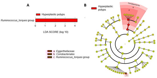 To identify changes that specifically affected the microbiota of individuals with hyperplastic polyps, we compared their fecal microbiota with that from the control group (Figure 3). LEfSe analysis at the genus level revealed a differentially higher abundance of Ruminococcus_torques in the feces of individuals with hyperplastic polyps as compared to the controls (Figure 3A). The corresponding cladogram also showed a differentially higher abundance of the family Eggerthellaceae and the order Coriobacteriales in the group with hyperplastic polyps (Figure 3B).