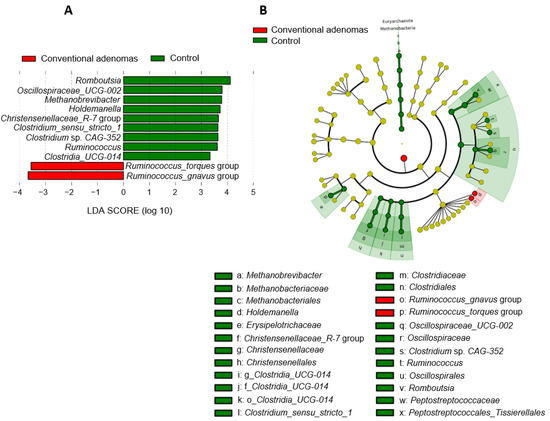 Differences in fecal microbiota compositions from individuals diagnosed with conventional adenomas compared with control samples. (A) Microbial taxa (at the genus taxonomic level) showing differential abundance according to linear effect size discriminant analysis (LEfSe) for the comparison of samples from individuals with conventional adenomas and individuals from the control group. (B) Cladogram generated from LEfSe between samples from individuals with conventional adenomas and the control group. Yellow circles represent bacterial taxa showing no significant differences between groups, and red circles represent taxa that were significantly more abundant in the group with conventional adenomas.