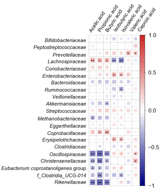 Heatmap defined by Spearman correlations in the sample population under study between most abundant microbial families (relative abundance ≥ 1%) and SCFAs. The intensity of red and blue colors represents the degree of positive and negative associations, respectively. (*) p < 0.05; (**) p < 0.01.