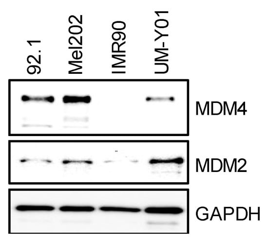 - de Lange, J.; Teunisse, A.F.; Vries, M.V.; Lodder, K.; Lam, S.; Luyten, G.P.; Bernal, F.; Jager, M.J.; Jochemsen, A.G. High levels of Hdmx promote cell growth in a subset of uveal melanomas. Am. J. Cancer Res. 2012, 2, 492–507. [Google Scholar] [PubMed]