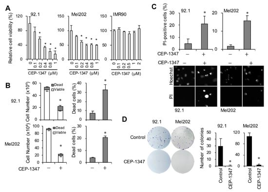 CEP-1347 induces growth inhibition and cell death in uveal melanoma (UM) cells. (A) The relative cell viability of human UM cell lines (92.1 and Mel202) and human normal fibroblasts (IMR90) treated with CEP-1347 for 3 days was determined by the WST-8 assay. (B,C) UM cell lines were treated with CEP-1347 (0.5 μM, 3 days). The numbers of viable and dead cells (left panels) as well as the percentage of dead cells (right panels) were determined by the trypan blue dye exclusion assay (B), or alternatively, the percentage of dead cells was determined by the propidium iodide incorporation assay (C, top panels). Representative images are shown (C, bottom panels). (D) Colony formation assay. Cells treated with CEP-1347 (0.5 μM) for 3 days and then cultured in its absence for another 10 days were stained with crystal violet. The values in a representative experiment are demonstrated as the means ± SD of triplicate samples. * p < 0.05 vs. treated without CEP-1347 (i.e., at 0 μM) by the Student’s t-test. Similar results were obtained from more than two separate biological replicates.