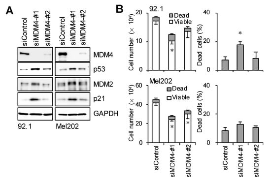 p53 activation by MDM4 depletion in uveal melanoma cells. (A) Immunoblot analysis of 92.1 and Mel202 cells transfected with an siRNA against MDM4 (#1 or #2) or a control siRNA (siControl) and cultured for 4 days. (B) Cells were transfected as in (A). Then, the numbers of viable and dead cells (left panels) as well as the percentage of dead cells (right panels) were determined by a trypan blue dye exclusion assay. Values represent the means ± SDs of triplicate samples from a representative experiment. * p < 0.05 vs. siControl by the Student’s t-test. Similar results were reproduced in two independent biological replicates.