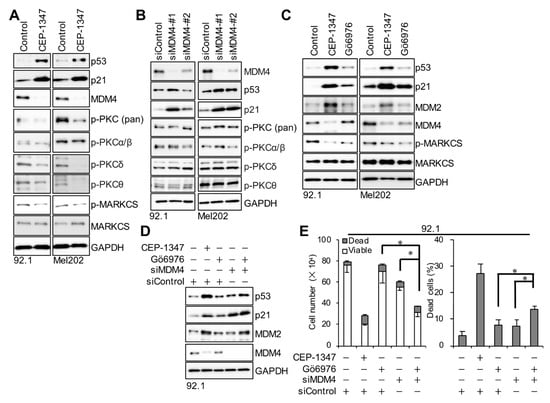 CEP-1347 inhibits PKC activity as well as MDM4 expression in uveal melanoma cells, which cooperate to activate p53 and inhibit cell viability. (A) Immunoblot analysis of 92.1 and Mel202 cells treated with CEP-1347 (0.5 μM, 3 days). (B) Immunoblot analysis of cells transfected with an siRNA against MDM4 (#1 or #2) or a control siRNA (siControl) for 4 days. (C) Immunoblot analysis of cells treated with CEP-1347 (0.5 μM) or Gö6976 (10 nM) for 3 days. (D) Immunoblot analysis of 92.1 cells transfected as indicated for 1 day and then treated with or without CEP-1347 (0.5 μM) or 10 nM Gö6976 (10 nM) for 3 days. (E) 92.1 cells were treated as in (D), and the trypan blue dye exclusion assay was conducted to calculate the numbers of viable and dead cells (left panels) as well as the percentage of dead cells (right panels). Values represent the means ± SDs of triplicate samples from a representative experiment. * p < 0.05 vs. siMDM4 + Gö6976 by the Student’s t-test. Similar results were reproduced in two independent biological replicates.