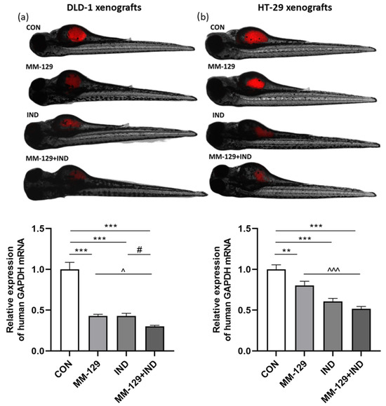 Impact of MM-129 (10 µM), IND (200 µM) or a combination of these agents (MM-129 + IND) on tumor development in DLD-1 (a), and HT-29 (b) zebrafish xenografts, and the expression of human GAPDH mRNA was determined at 120 hpf. Data were presented as mean ± standard deviation (SD) and analyzed using one-way analysis of variance (ANOVA). n = 20 each group; ** p < 0.01, *** p < 0.001 vs. CON; ^ p < 0.05, ^^^ p < 0.001 vs. MM-129; # p < 0.05 vs. IND.