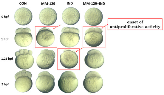 In our experiment, we noticed a disruption in cell division in all experimental groups, while no disturbances were observed in the control group (Figure 2). However, the mentioned disturbances did not manifest at the same time spot. Only in the groups exposed to MM-129 and MM-129 + IND did we observe cell division arrest after 1 h. Cell division was also impaired by IND administrated alone; nevertheless, this effect occurred in the next stage of proliferation. The first changes in the development impairment were visible after 1.25 hpf, meaning on the stage of eight cells. After 2 h, we observed definitive proliferation inhibition in all experimental groups, while the development of untreated embryos was preserved without prejudice. This demonstrated the antiproliferative potential of both tested compounds; however, it suggested that MM-129 was more potent to inhibit cell division than IND alone.