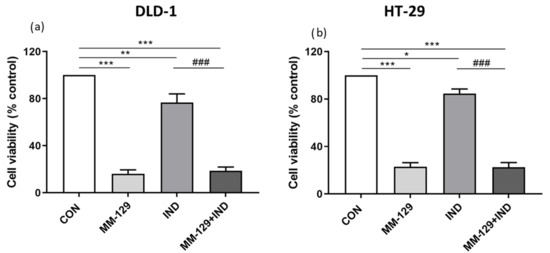 Viability of DLD-1 (a) and HT-29 (b) colon cancer cells treated for 24 h with MM-129 (10 µM), IND (200 µM), and compound combination (MM-129 + IND). Results are presented as mean values ± standard deviation (SD) from three independent experiments performed in duplicate. * p < 0.05, ** p < 0.01, *** p < 0.001 vs. CON; ### p < 0.001 vs. IND.