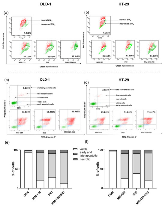 Representative dot-plots illustrating the loss of mitochondrial membrane potential, ΔΨm. (a,b) Flow cytometry dot-plots for the annexin V-FITC-propidium iodide assay (c,d) and quantitative chart illustrating the distribution of live, early, and late apoptotic and necrotic cells (e,f) of DLD-1 (a,c,e) and HT-29 (b,d,f) after 24 h exposition to MM-129 (10 µM), IND (200 µM), and MM-129 + IND. Values were obtained from three independent experiments.