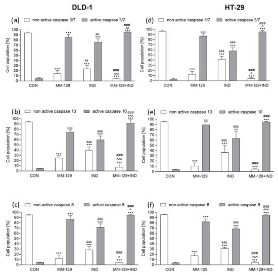Flow cytometric analysis of caspase-3/7, caspase-10, and caspase-8 activation in DLD-1 (a–c) and HT-29 (d–f) colon cancer cells exposed to MM-129 (10 µM), IND (200 µM), and MM-129 + IND for 24 h. Values from three independent experiments performed in duplicate were presented as mean ± standard deviation (SD) and analyzed using one-way analysis of variance (ANOVA). ** p < 0.01, *** p < 0.001 vs. CON; ^ p < 0.05, ^^ p < 0.01, ^^^ p < 0.001vs. MM-129; ### p < 0.001 vs. IND; && p < 0.01, &&& p < 0.001 IND vs. MM-129.