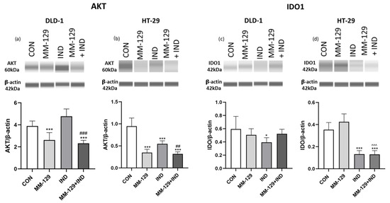 The downregulation of protein kinase B (AKT) (a,b) and indoleamine 2,3-dioxygenase-1 (IDO1) (c,d) exerted by MM-129 (10 µM), IND (200 µM), or MM-129 + IND toward DLD-1 and HT-29 colorectal cancer cells after 24 h exposition. The values were obtained from three independent experiments performed in duplicate. * p < 0.05, *** p < 0.001 vs. CON; ^^^ p < 0.01 vs. MM-129; ## p < 0.01, ### p < 0.001 vs. IND. Images and quantification were obtained by capillary protein separation and immunodetection. The uncropped blots are shown in the supplemental materials.