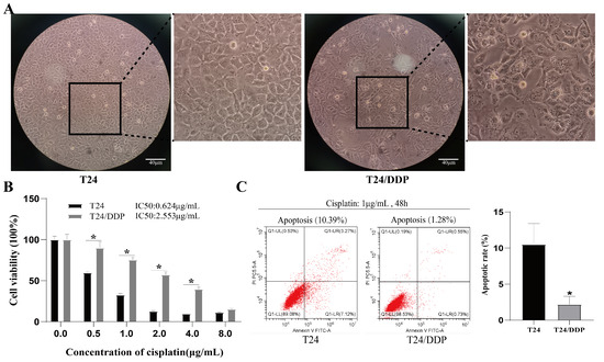 Construction of the T24/DDP cell lines. (A) Morphology of the T24 and T24/DDP cell lines under a microscope; scale bar: 40 µm. (B) IC50 of T24 and T24/DDP cell lines against cisplatin was detected with CCK 8 assay. (C) Apoptosis rate was determined with flow cytometry. * p < 0.05 signifies a statistically significant difference.