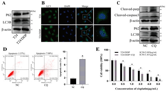 Autophagy mediates cisplatin resistance in bladder cancer. (A) Expression of autophagy marker proteins P62 and LC3B were determined with Western blot. (B) Autophagosome formation was detected with immunofluorescence; scale bar: 20 µm. (C) Expression of autophagy and apoptosis marker proteins were determined with Western blot. (D) Apoptosis rate was determined with flow cytometry. (E) IC50 of T24/DDP cell line against cisplatin was detected with CCK 8 assay. * p < 0.05 signifies a statistically significant difference.