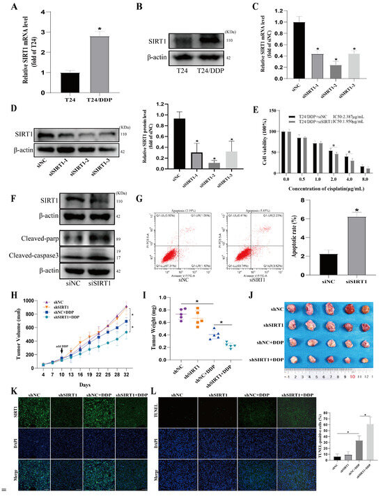 SIRT1 mediates cisplatin resistance in bladder cancer. (A) The mRNA expressions of SIRT1 in T24 and T24/DDP cell lines were determined with RT-qPCR. (B) The protein expressions of SIRT1 in T24 and T24/DDP cell lines were determined with Western blot. (C) The silencing efficiency of SIRT1 was assessed with RT-qPCR. (D) The silencing efficiency of SIRT1 was assessed with Western blot. (E) IC50 of the T24/DDP cell line against cisplatin was detected with CCK8 assay. (F) Expressions of SIRT1 and apoptosis marker proteins were determined with Western blot. (G) Apoptosis rate was determined with flow cytometry. (H–J) Tumor xenografts were established in BALB/c nude mice using T24/DDP cells stably transfected with SIRT1 shRNA or NC shRNA. Tumor size was recorded every three days. After one week, an equivalent amount of DDP (2.5 mg/kg) or 0.9% normal saline was intraperitoneally injected every 3 days. Tumor size (H), tumor weight (I), and tumor images (J) are shown (5 mice/group). (K) The expression of SIRT1 was detected with immunofluorescence; scale bar: 50 µm. (L) TUNEL staining to assess tumor cell apoptosis; scale bar: 100 µm. * p < 0.05 signifies a statistically significant difference.