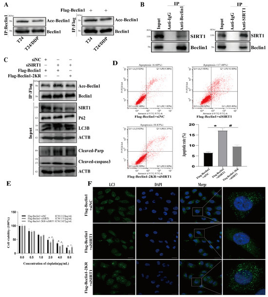 SIRT1 activates autophagy via Beclin1 deacetylation. (A) The acetylation of Beclin1 in the T24 and T24/DDP cell lines was determined with IP experiments. (B) The interaction of SIRT1 and Beclin1 was determined with CO-IP experiments. (C) The expressions of Beclin1 acetylation and autophagy and apoptosis marker proteins were determined with Western blot. (D) Apoptosis rate was determined with flow cytometry. (E) IC50 of the T24/DDP cell line against cisplatin was detected with CCK8 assay. (F) Autophagosome formation was detected with immunofluorescence; scale bar: 20 µm. * p < 0.05 vs. Flag-Beclin1 + siNC group, # p < 0.05 vs. Flag-Beclin1 + siSIRT1 group.