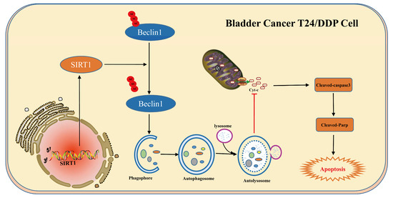 Acetylation is an important post-translational modification, and many autophagy-related proteins have been shown to be regulated by acetylation [5]. SIRT1 is a nicotinamide adenine dinucleotide (NAD+)-dependent class III histone deacetylase involved in the regulation of the acetylation of several autophagy-related proteins, including LC3, ATG7, and ATG5 [6,7,8,9]. It plays a crucial role in autophagy regulation, chemotherapy resistance, drug development, and tumorigenesis [10,11]. However, the specific mechanism through which SIRT1 mediates cisplatin resistance in bladder cancer via autophagy remains unclear.