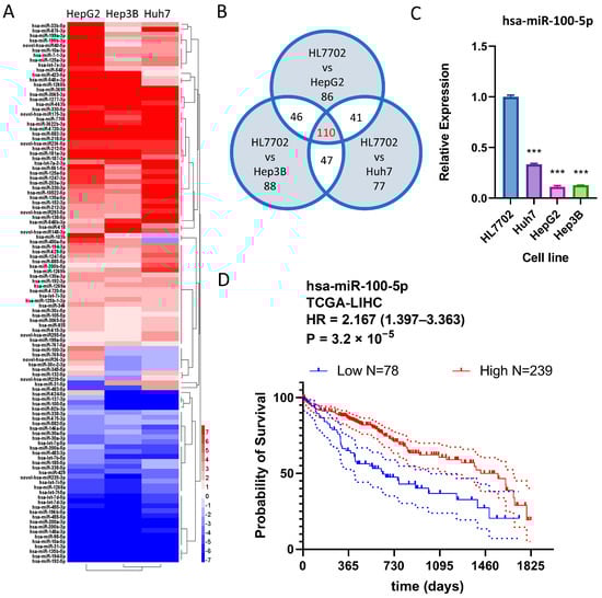 The dysregulated expression of miRNA genes is a common occurrence in HCC and may influence patient prognosis [11,12,13]. To identify common miRNA changes in HCC, we analyzed Huh7, established from a 57-year-old Japanese male, HepG2, established from a 15-year-old Argentinean Caucasian male, and Hep3B, established from an 8-year-old black male. Of 1655 differentially expressed miRNAs, 110 were consistently differentially expressed in all three HCC cell lines, indicating they were commonly dysregulated in HCC (Figure 2A,B). To determine whether these miRNAs were associated with HCC prognosis, the correlation between the dysregulation of these miRNAs and TCGA-LIHC patient prognosis was investigated using OncoLnc web tools. While both miRNA hsa-miR-769-5p and hsa-miR-1269a, implicated in HCC, were overexpressed in HCC cell lines, hsa-miR-100-5p, which promotes overall survival in HCC patients, was the only HCC prognosis-related miRNA that showed downregulation in three HCC cell lines (Table 1). hsa-miR-100-5p was selected for further investigation due to its highest hazard rating among all candidate dysregulated miRNAs. The downregulation of hsa-miR-100-5p in HCC cell lines was confirmed via q-PCR (Figure 2C). With optimized expression cut-point, survival analysis based on TCGA-LIHC data indicated that low hsa-miR-100-5p expression is associated with significantly worse overall survival time (HR = 2.167, 1.397–3.363 95%CI) (Figure 2D), suggesting that hsa-miR-100-5p is a tumor-suppressing miRNA.