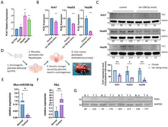 Hsa-miR-100-5p targets well-known oncogenes gene PKL1. (A) q-PCR revealed increased PLK1 expression in HCC cell lines compared to normal liver cells; * p < 0.05, ** p < 0.01 via Student’s t-test against mRNA expression level in HL7702. (B) Transient transfection of hsa-miR-100-5p mimic inhibited PLK1 expression in HCC cell lines; ** p < 0.01, *** p < 0.001 via Student’s t-test against control (the same cell line transfected with scrambled miRNA control) PLK1 expression level. (C) The results of a Western blot analysis indicate that the transient transfection of hsa-miR-100-5p-mimic led to a reduction in PLK1 protein expression in HCC cell lines. GAPDH was used as an internal control in each cell line, and the average densitometry reading of each cell line was normalized to 100, respectively. The statistical analysis showed that the reduction was significant, with * p < 0.05 and ** p < 0.01 by Student’s t-test compared to the control. (D) The diagram demonstrated the hydrodynamic transfection of the liver cancer mouse model. The picture of a mouse liver with tumors was taken four weeks after treatment. (E) q-PCR showed decreased mus-miR-100-5p (mouse ortholog of hsa-miR-100-5p) expression in mouse liver tumors compared to normal liver; both the tumor group and normal group represent assay results from 5 individuals; * p < 0.05 via Student’s t-tests against miRNA expression levels in normal liver. (F) q-PCR showed increased Plk1 (mouse ortholog of PLK1) expression in mouse liver tumors compared to the normal liver; both tumor group and normal group represent assay results from 5 individuals; ** p < 0.01 by student-T tests against mRNA expression levels in the normal liver; (G) Western blot analysis shows higher liver Plk1 level in tumor group, compared to the normal group. N1 to N4 represented four individuals in the normal group, while T1 to T4 represented four individuals in the tumor group. The average PLK1/GAPDH densitometry readings from the normal group were normalized to 100.
