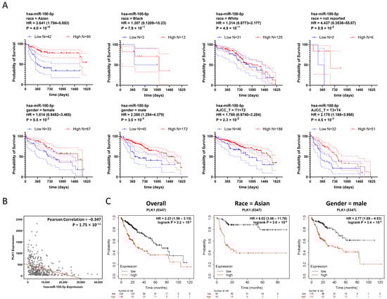Meanwhile, the correlation analysis based on TCGA-LIHC data revealed a negative correlation between PLK1 and hsa-miR-100-5p expression (Figure 4B). Survival analysis also showed that increased PLK1 expression was associated with poor HCC prognosis in TCGA-LIHC patients (HR = 2.23 (1.58–3.15)) (Figure 4C). As PLK1 was strongly associated with hsa-miR-100-5p, we conducted PLK1 dysregulation survival analysis for TCGA-LIHC data using the same stratification strategy. The result displayed a correlation pattern from hsa-miR-100-5p, while the Asian subgroup with high PLK1 expression was associated with the highest hazard ratio (HR = 6.02 (3.08–11.78) (Figure 4C) indicated that PLK1 dysregulated overexpression may involve the Asian population specificity of hsa-miR-100-5p.