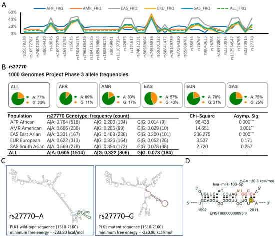 rs27770–G is a high-frequency allele within the East Asian population that could alter the interaction between PLK1 and hsa-miR-100-5p. (A) 1000 Genomes Project Phase 3 data showed that 35 SNPs with a high global MAF have significantly different allele frequencies in the five major population groups. AFR, African; AMR, American; EAS, East Asian; EUR, European; SAS South Asian. (B) Allele frequency of rs27770–G was higher in the East Asian population, resulting in significant diversity in the genotypic frequency distribution. The pie chart displays the frequency of alleles for rs27770 in each population, and the table shows genotype frequencies. (** p < 0.01, *** p < 0.001 via chi-square tests for genotype) (C) rs27770–G alters PLK1 mRNA secondary structure. The major mRNA structural change is marked in red against that of rs27770–A, marked in green. (D) rs27770–G resulting in an additional seedless hsa-miR-100-5p binding site between 1992–2011 nt. rs27770–G is highlighted and marked with red basket at 2010 nt.