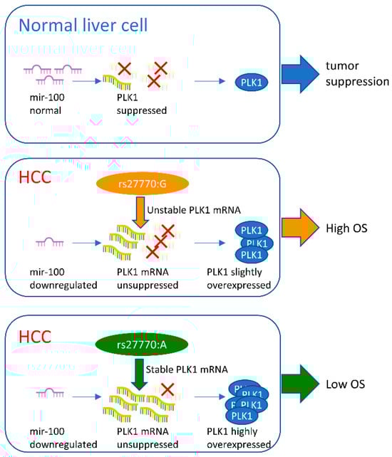 Schematic diagram showing the change in hsa-miR-100-5p/PLK1 interaction with PLK1 due to rs27770. Normally, hsa-miR-100-5p expression regulates PLK1 expression through mRNA degradation (marked with red X). In HCC cells, hsa-miR-100-5p dysregulates downregulation, resulting in disorderly high PLK1 expression associated with bad prognosis for HCC patients. A relatively higher hsa-miR-100-5p expression level combined with the rs27770–G allele in PKL1 resulted in a less serious PLK1 disorder related to a better prognosis in Asian HCC patients.