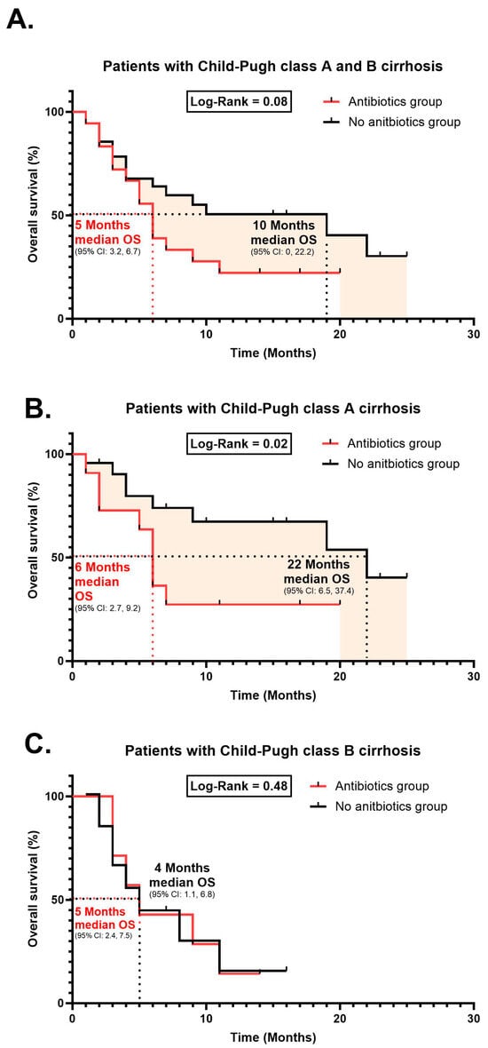 We further examined patients’ survival curves based on both Child–Pugh class A and B and found no significant differences between the group with antibiotics vs. the group without antibiotics (p = 0.08; Figure 1A). Notably, the median overall survival in patients with Child–Pugh class A significantly decreased (p = 0.02; Figure 1B) in patients with antibiotic use (6 months, 95% CI: 2.7, 9.2) compared to patients without antibiotic use (22 months, 95% CI: 6.5, 37.4). Patients’ survival curves based on Child–Pugh class B (Figure 1C) were similar between both groups (p = 0.48; Figure 1C).