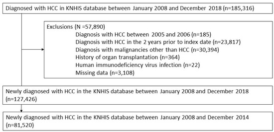 We screened a total of 185,316 adult men or women who participated in the KNHIS from January 2008 to December 2018. Among them, we excluded 57,890 participants who met the following exclusion criteria: (1) HCC diagnosis between 2005 and 2006 (n = 185), (2) HCC diagnosis in the 2 years prior to the index date (n = 23,817), (3) diagnosed with malignancies other than HCC (n = 30,394), (4) history of organ transplantation (n = 364), (5) human immunodeficiency virus (HIV) infection (n = 22), and (6) missing data (n = 3108). Consequently, 127,426 patients were newly diagnosed with HCC between January 2008 and December 2018, without HCC within 2 years before the index date, other cancers, organ transplantation, or HIV infections. Among them, a total of 81,520 participants diagnosed with HCC between January 2008 and December 2014 were analyzed (Figure 1).