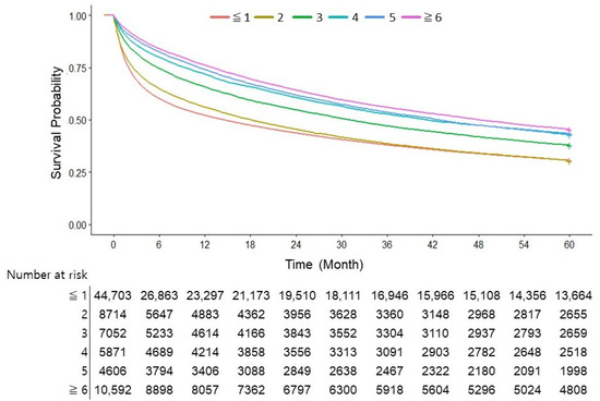 We obtained information on chronic hepatitis and its causes from the database of medical treatments. Based on the HCC cause, patients were classified into hepatitis B virus (HBV)-related, hepatitis C virus (HCV)-related, alcohol-related, and others-related HCC. The use of antiviral therapy during the follow-up period was identified using KDATCC codes, including lamivudine, adefovir, entecavir, tenofovir disoproxil fumarate, tenofovir alafenamide, tenofovir disoproxil aspartate, telbivudine, clevudine, and besifovir for HBV, and ribavirin and interferon for HCV. The presence of comorbidities was determined by ICD-10 codes and then quantified using the Charlson Comorbidity Index (CCI). The initial treatment for HCC included liver transplantation, hepatectomy, local ablation therapy, transarterial chemotherapy, sorafenib, radiotherapy, best supportive care, and others. A more detailed description of each definition, including the relevant ICD codes and KDATCC codes, is available in Supplementary Table S1.