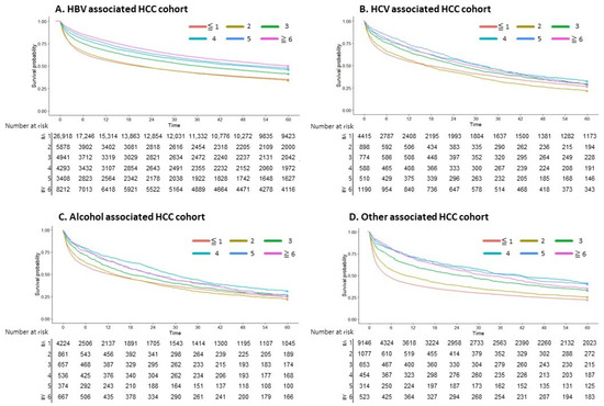 A notable increase in survival starting from the third AFP test was seen in the overall cohort, with a gradual improvement observed as the number of tests increased (p < 0.001; Figure 3). When examining the data based on the underlying causes of HCC, patients with HBV demonstrated a distinct survival improvement as the number of AFP tests increased. No significant difference was observed between undergoing one or two tests (p = 0.51). However, survival increased progressively in patients who underwent three or more tests. In cases of HCV- and alcohol-associated HCC, a significant survival benefit was confirmed in patients who underwent AFP testing three or more times. For other HCC cases, a significant survival benefit was confirmed with two or more AFP tests (Figure 4).