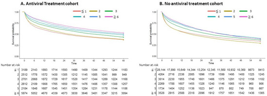 Survival curve according to the number of AFP tests in patients with and without receiving antiviral treatment. (A) Antiviral treatment cohort. (B) No antiviral treatment cohort.
